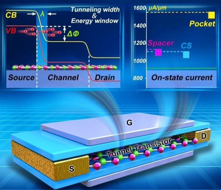 隧道場效應晶體管(TFET-Tunnel Field Effect Transistor),和傳統MOSFET晶體管原理不同,在TFET中源極和漏極摻雜不同。它使用量子力學隧道效應,柵極和源極之間的電壓決定了電荷載流子是否可以“隧穿”通過源極和漏極之間的能量勢壘,以及電流是否可能流動。