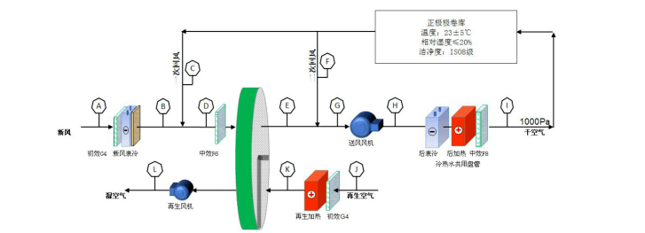 2)低濕需求空調房間,如正極輥壓間、正極分條間、正極模切間以及正極二分間等房間,其濕度控制需求為≤20%,以及正極涂布間、負極輥壓間、負極分條間、負極模切間以及負極二分間等房間,其濕度控制需求為≤45%,該需求通過冷卻除濕很難實現,因此往往通過轉輪除濕機組處理后來滿足使用需求,機組中設置一級轉輪。