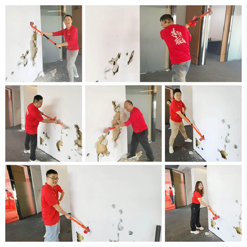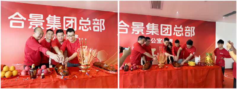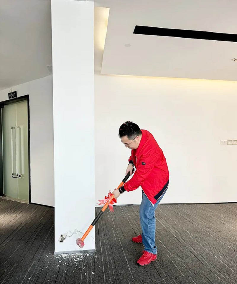 紅桌、紅錘、紅毯,色澤鮮亮紅潤的乳豬,紅紅火火!一錘開工大吉,二錘財源廣進,三錘萬事如意!伴隨著禮花的綻放,合景人手握禮錘,一同為新辦公區裝修開工儀式揭開序幕。在熱烈的掌聲中,大家共同慶祝辦公樓裝修工程的正式啟動!